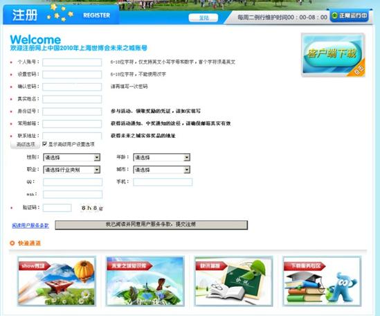 进入网上世博会未来之城频道地址,点击“用户注册”进入注册页面;